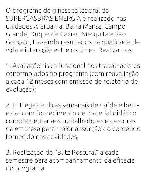 Realizamos a ginástica laboral de forma progressiva, ou seja, os exercícios são diferentes de acordo com o horário aplicado, grupo e perfis de trabalho, a fim de se obter um maior benefício físico e mental dos seus colaboradores. Ele pode ser feito:
